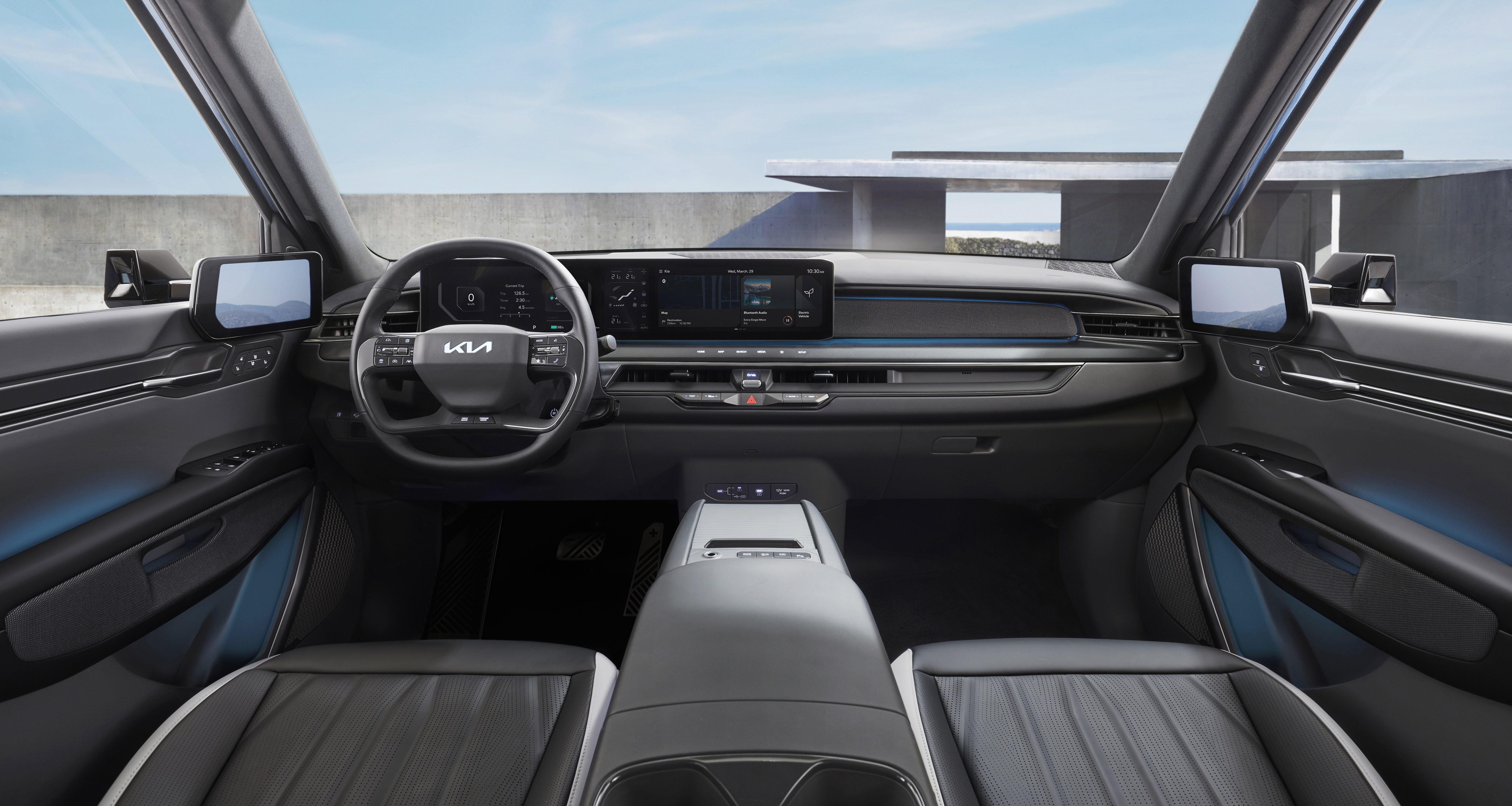 The EV9 boasts a stunning design, blending contrasting shapes in harmony with its Opposite United design principle. It also marks the first application of Kia's '3-Stage Sustainable Design Strategy'. The vehicle offers various flagship features, such as auto flush outside handles, digital side and center mirrors, Meridian premium sound system, built-in cam 2, digital key 2, and a front trunk with an electronic hood latch.